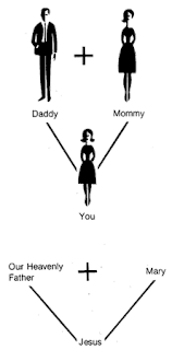 On page 126 of this official LDS Church manual, the following graphic is shown of the figures of a man, woman, and child. LDS parents are advised how they should use this graphic to illustrate to their children “how Jesus was the only begotten Son of God.” Daddy plus Mommy equals you; Heavenly Father plus Mary equals Jesus.